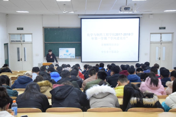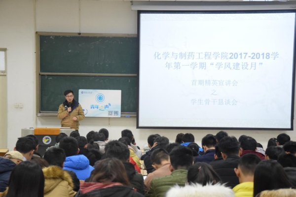 为加强教风学风建设,促进共同成长。12月7日,化工学院于1号教学楼B221教室举办“学风建设月之学生骨干宣讲会”主题讲座。本次活动化工学院15级优秀学生骨干张景超、程大勇主讲,团委老师盛霄、17级学生100余人参与此次活动。
