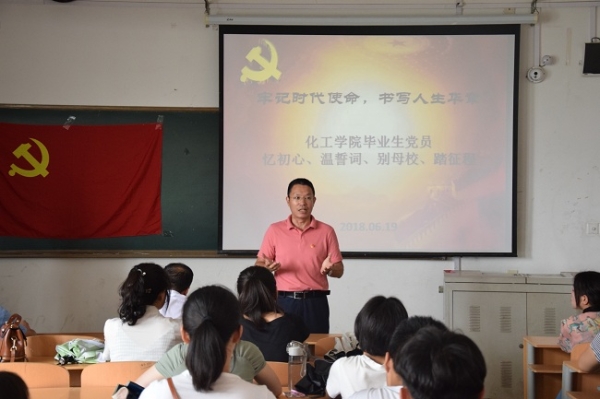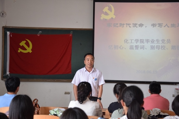 为做好毕业生文明离校相关工作,发挥党员先锋带头作用,6月19日,化工学院在1号教学楼B406举办“牢记时代使命,书写人生华章”毕业生党员文明离?;疃?,化工学院党委书记姜洪雷,副书记许有强和全体毕业生党员参加了活动?;疃裳г和盼榧强追狈敝鞒?。