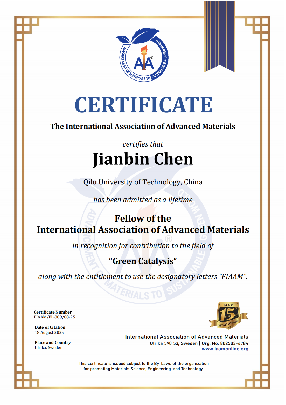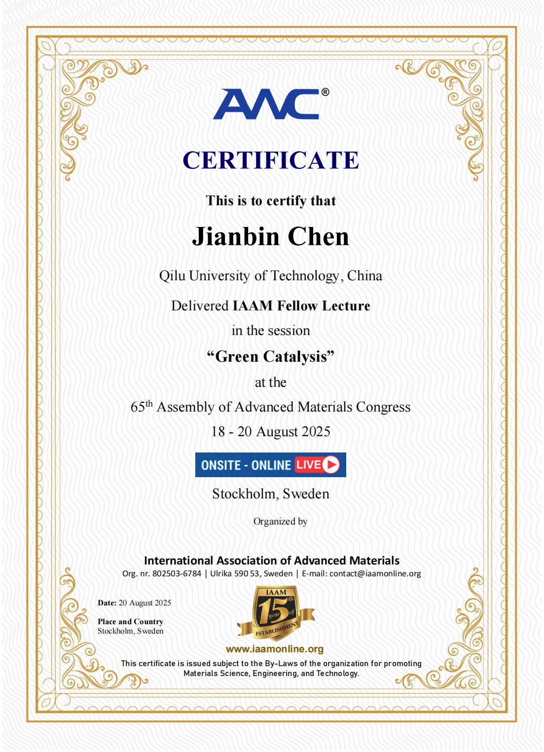 近日,化学与制药学部陈建宾教授被国际先进材料协会(IAAM, International Association of Advanced Materials)授予“终身会士”(Lifetime Fellow)荣誉称号,以表彰他在绿色催化领域的前沿探索与突出贡献。