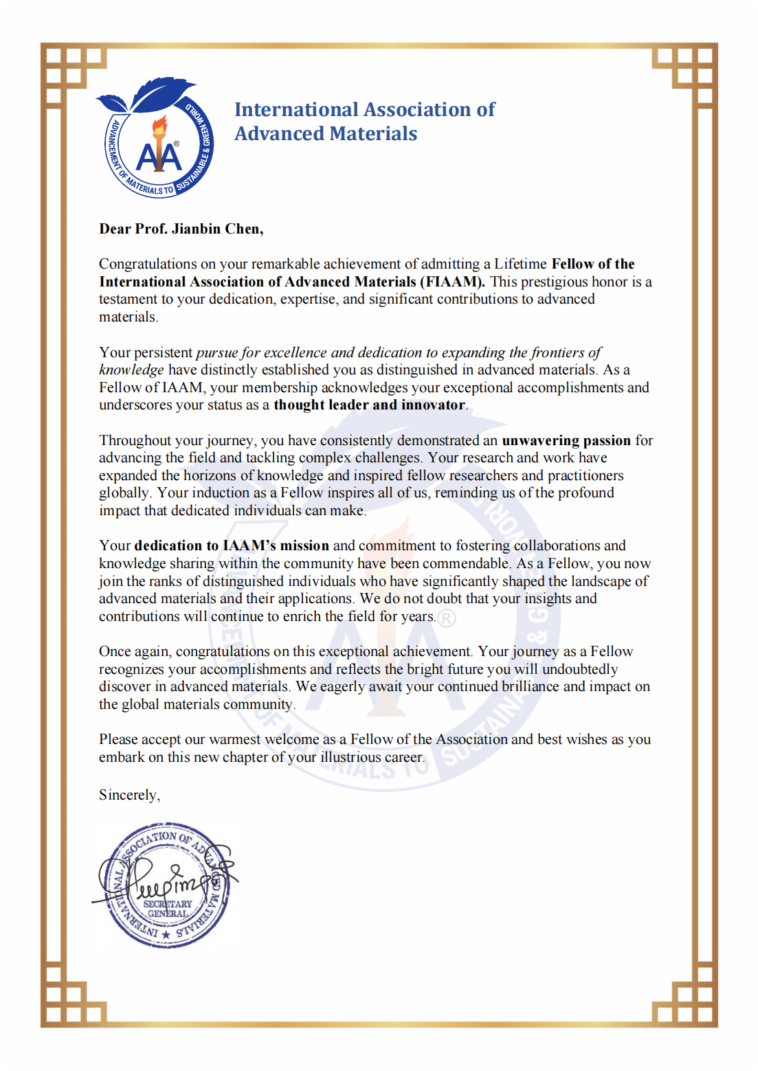 国际先进材料学会(IAAM)成立于2010年,总部设在瑞典,是一个致力于推动全球先进材料、工程和技术发展的非营利性国际学术组织,为先进材料科学、工程和技术在世界范围内快速发展提供一个高水平的学术平台。该学会的会员包括全球150多个国家的10万多名科学家。IAAM“终身会士”是全球范围内授予在材料科学、工程和技术领域做出独创性且重要贡献科研人员的殊荣,评选通过专家题名、学术委员评审、学术演讲等环节进行遴选产生。
