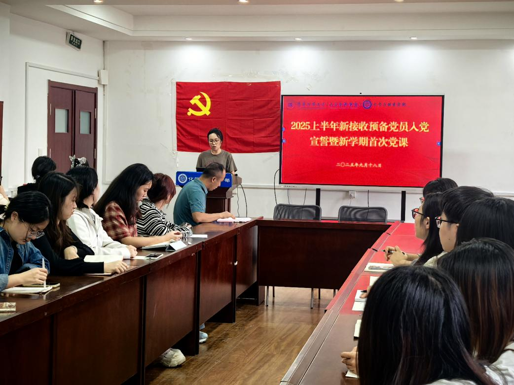 宣誓后,预备党员代表周艺岚发言,表示将坚定理想信念,恪守党的纪律,发挥先锋模范作用,要以习近平新时代中国特色社会主义思想为指导,增强“四个意识”、坚定“四个自信”、做到“两个维护”,并承诺深耕专业、锤炼本领,将个人理想融入党和人民事业。