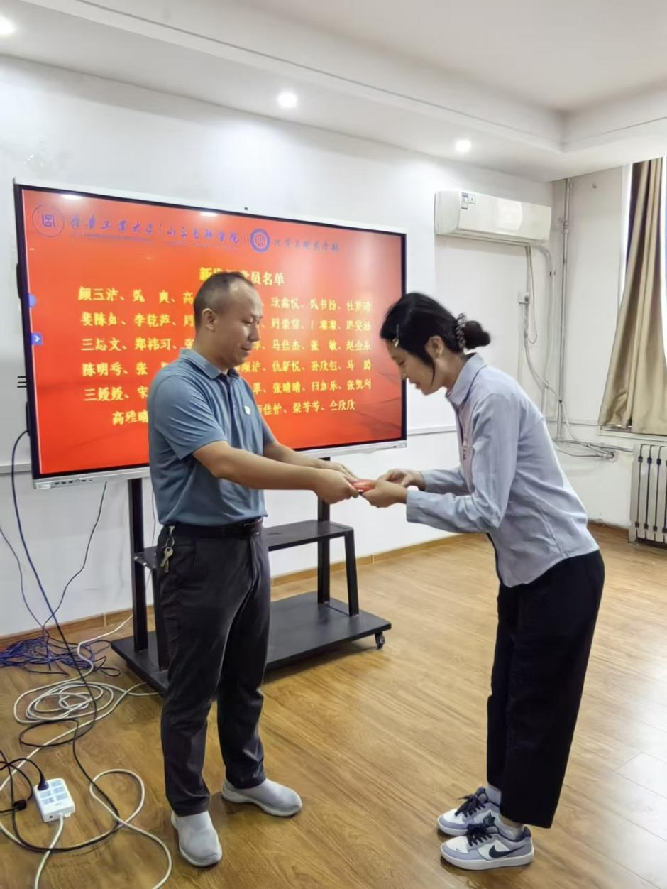 仪式在庄严的《国际歌》中开始,董成稳宣读新接收预备党员名单,并为他们授予党员徽章、发放学习记录本。他强调,党员徽章是党的象征,党员应规范佩戴,维护党的形象。随后,在王梦瑶的带领下,预备党员面向党旗紧握右拳,庄严宣誓,表达永远跟党走的坚定信念。