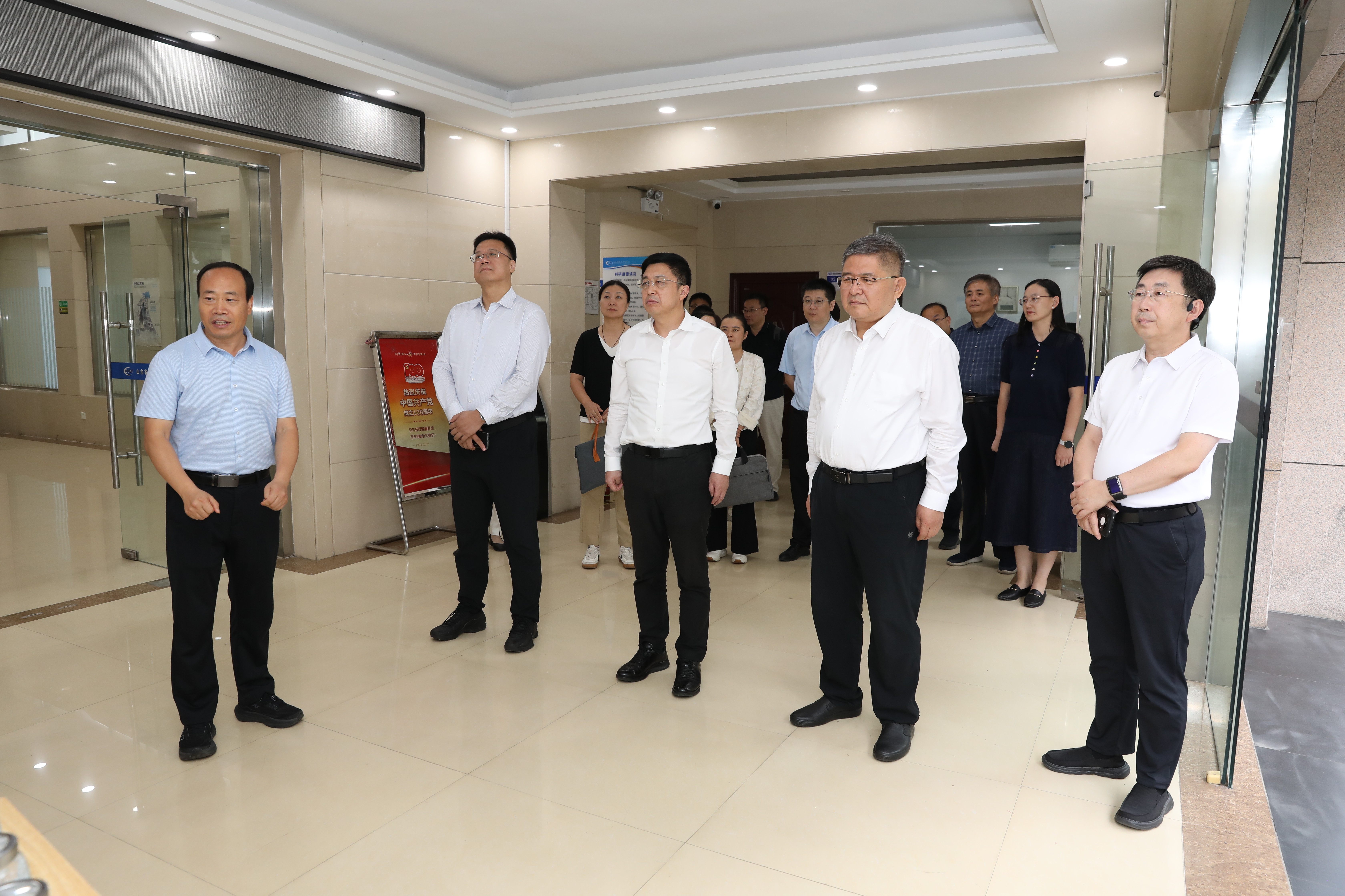 9 月 18 日下午,省科技厅副厅长祝恩元、青岛市科技局局长李天传一行莅临齐鲁工业大学(山东省科学院)化学与制药学部测试中心参观调研。校(院)党委书记吴衍涛、副校(院)长杨美红陪同调研。